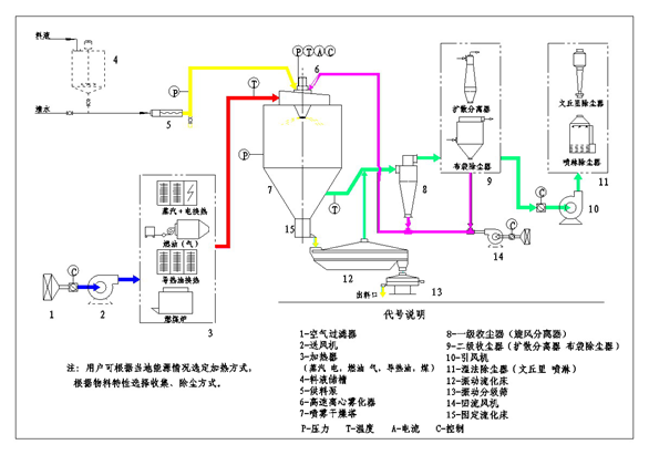 閉路循環(huán)離心噴霧干燥機熱煙道氣流動通過其中的大部分熱能被傳遞到空氣/蒸汽混合物中循環(huán)的閉合干燥空氣回路的熱交換器。經(jīng)冷卻的煙道氣(廢氣)離開熱交換器,并通過排氣鼓風機,被在140-180 ℃的溫度下釋放到大氣通過排氣堆棧?! ?br />        此外,BLPG閉路循環(huán)離心噴霧干燥機熱能需要通過空氣 - 空氣熱交換器干燥該物料轉(zhuǎn)移。該干燥空氣被包含在一個封閉的回路系統(tǒng)使大量的熱回收的利益,因此使得該工藝比其它系統(tǒng)范圍內(nèi)。此外,由于初級能量產(chǎn)生源是分開的,而不是在與物料直接接觸,有火花或在燃燒室內(nèi)產(chǎn)生熱粒子的風險,被直接運送到其中潛在的高層次的炸藥或可燃材料是本?! ?br />        當空氣經(jīng)過鼓,其蒸發(fā)水從物料。該空氣/蒸汽混合物然后從干燥的物料分離在組合的旋流器/過濾器單元,并返回到熱交換器用于再加熱,其中其溫 度從120℃升至約400-450℃。